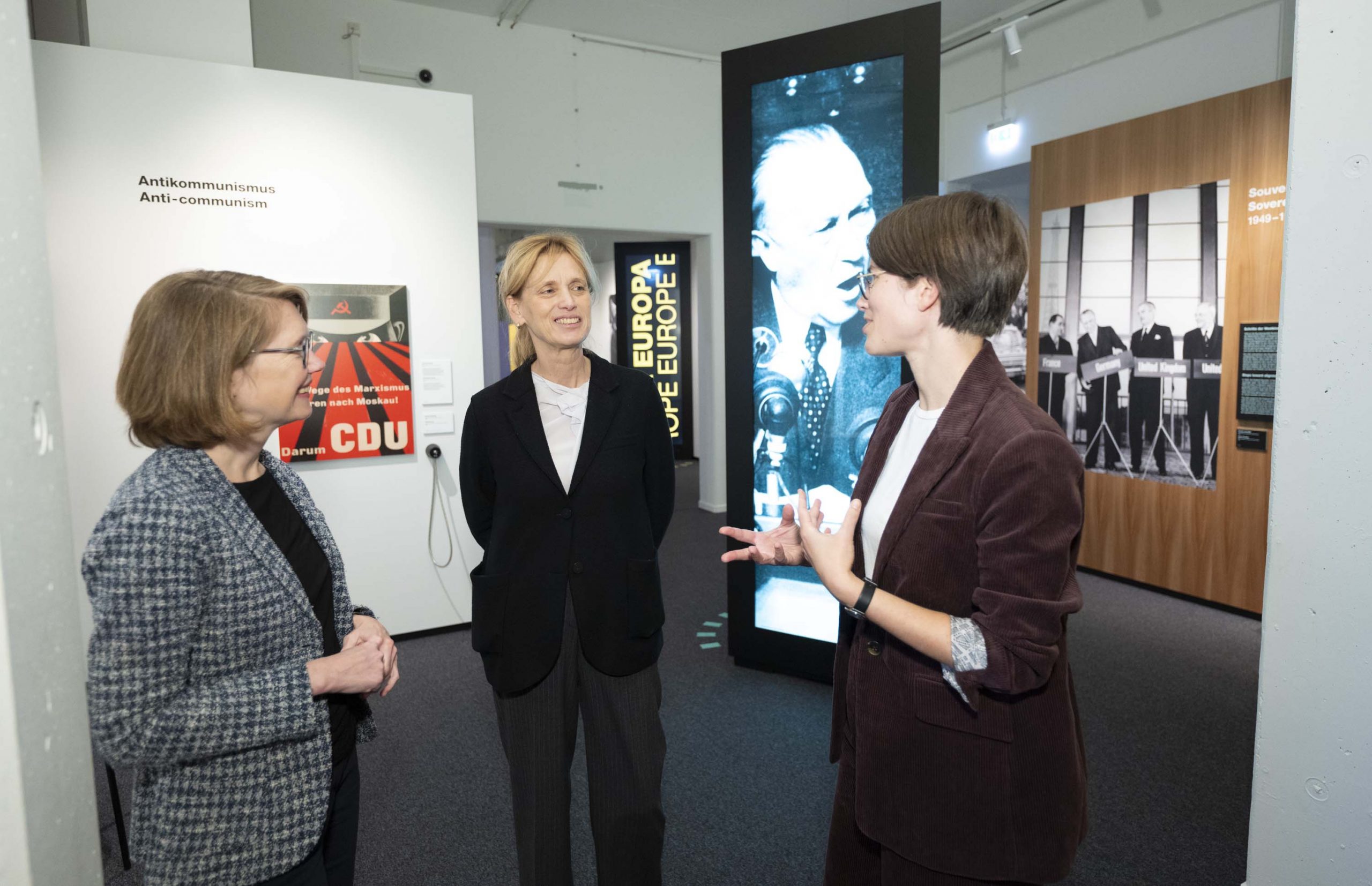 Seit einem Jahr zeigt das Konrad-Adenauer-Forum in Berlin Flagge. In der Behrenstraße 18 könnt Ihr eine sehr gut gemachte Ausstellung zur Kanzlerzeit Adenauers anschauen. Diese Woche hat Bundesbildungsministerin Karin Prien die Gelegenheit genutzt und das Konrad-Adenauer-Forum besucht. Ihr Ministerium ist in unmittelbarer Nähe. Für die Führung von Geschäftsführerin Dr. Sabine Schößler und Standortleiterin Dr. Doreen Franz hat sie sich eine Stunde Zeit genommen. Und offensichtlich hat sie ihren Adenauer gelesen. An vielen der thematischen Stationen – von der Wiederbewaffnung bis zum deutsch-französischen Verhältnis – wurde intensiv diskutiert. Auch über die kürzlich erschienenen Adenauer-Biografien war die Ministerin sehr gut im Bild.